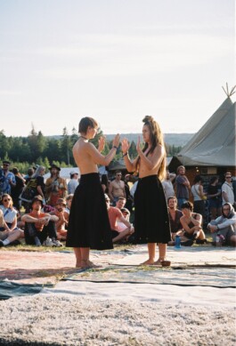 Ωma is ohms: resistance—an electrical, political, and physical force. We channel the flow of conductivity running through our bodies and the voltage transmitted via our linked skins, influencing the sonic landscape with our movements Through a DIY synthesizer, we bring to life the pulsating sound of electricity. Calling on the elements to contain a circle of electrical charge, we dance in between the battle of polarities. Ωma is a sonic dance performance dedicated to the fusion of polarities and the communal rite of togetherness.